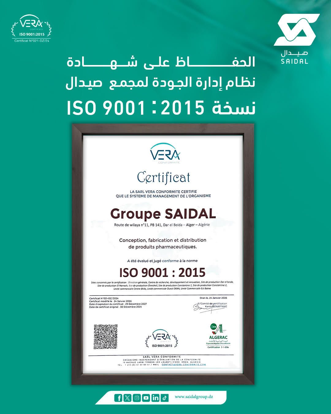 Fondé en 1982 pour répondre au besoin d’assoir une industrie pharmaceutique locale à même de garantir la disponibilité des médicaments et améliorer l’accès des citoyens aux traitements, Saidal est aujourd’hui organisé en Groupe industriel spécialisé dans le développement, la production et la commercialisation des produits pharmaceutiques à usage humain.